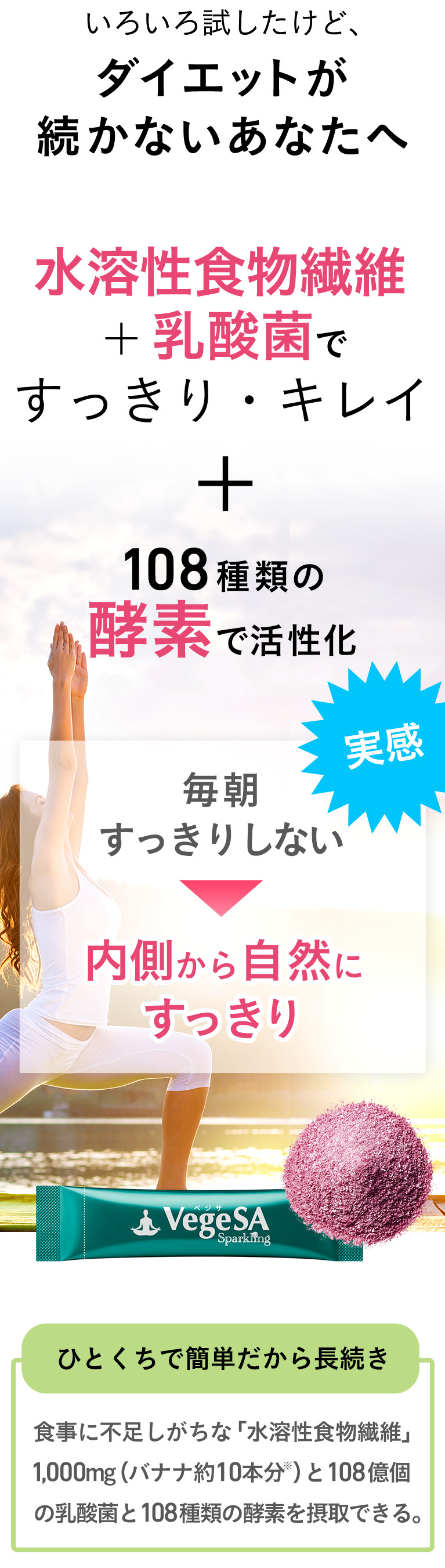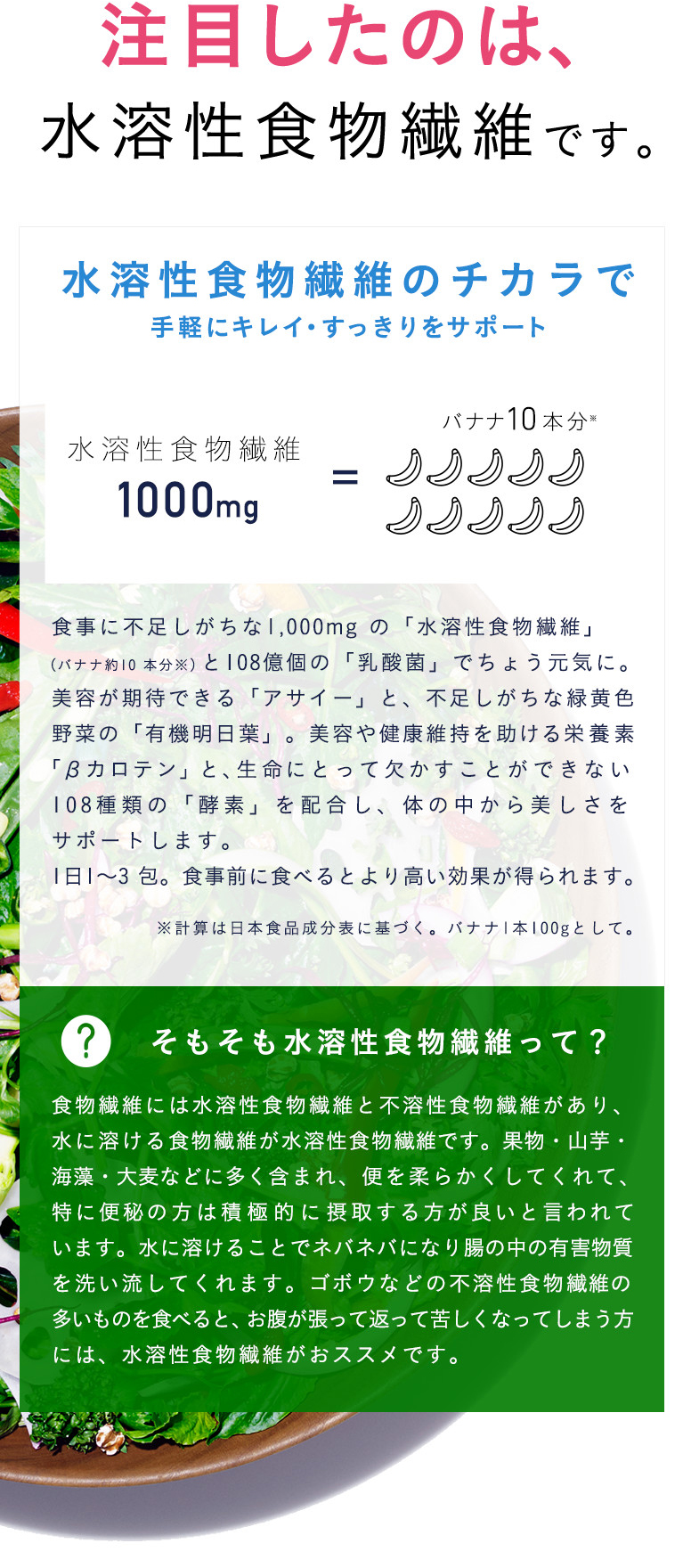 食事に不足しがちな1,000mg の「水溶性食物繊維」(バナナ約10 本分※)と108億個の「乳酸菌」で腸内を改善。美容が期待できる「アサイー」と、不足しがちな緑黄色野菜の「有機明日葉」。皮膚や粘膜の健康維持を助ける栄養素「βカロテン」と、生命にとって欠かすことができない108種類の「酵素」を配合し、体の中から美しさをサポートします。1日1~3包を目安に食べると高い実感が得られます。 そもそも水溶性食物繊維って?食物繊維には水溶性食物繊維と不溶性食物繊維があり、水に溶ける食物繊維が水溶性食物繊維です。果物・山芋・海藻・大麦などに多く含まれ、便を柔らかくしてくれて、特に便秘の方は積極的に摂取する方が良いと言われています。水に溶けることでネバネバになり腸の中の有害物質を洗い流してくれます。ゴボウなどの不溶性食物繊維の多いものを食べると、お腹が張って返って苦しくなってしまう方には、水溶性食物繊維がおススメです。